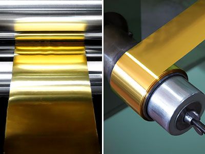 Der erkaltete Barren wird nun mechanisch zu einem etwa 100 Meter langen und 4 Zentimeter breiten Band gewalzt. Zwischen den Walzvorgängen muss das Goldband immer wieder im Ofen geglüht werden, um Sprödigkeit zu vermeiden.